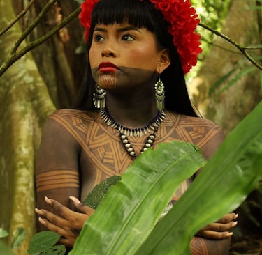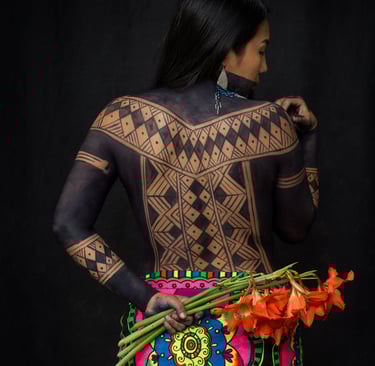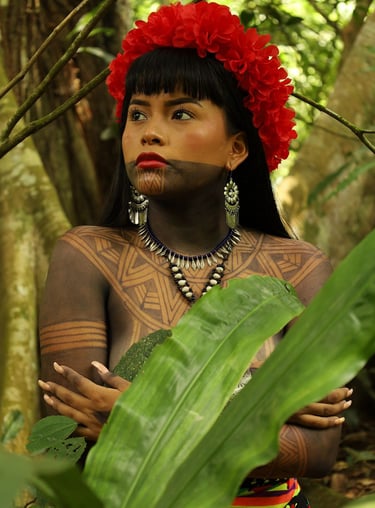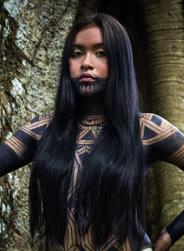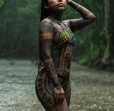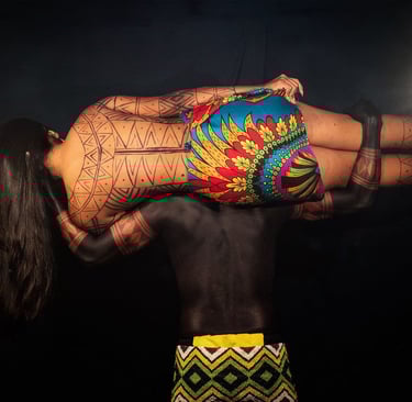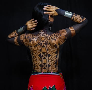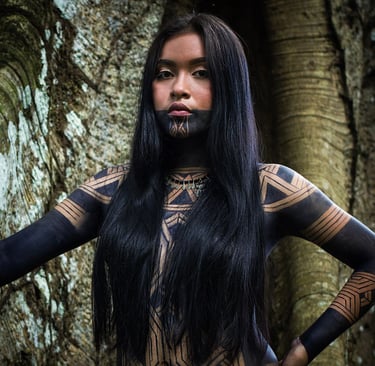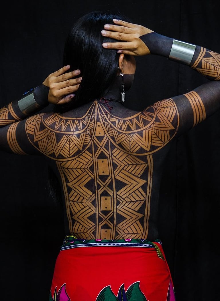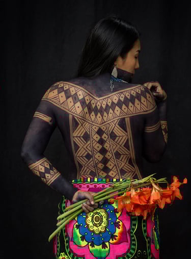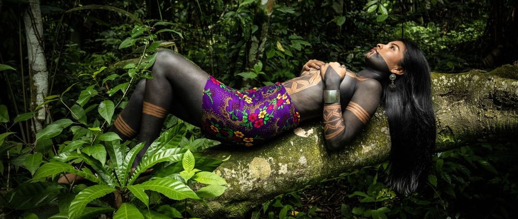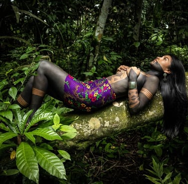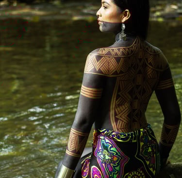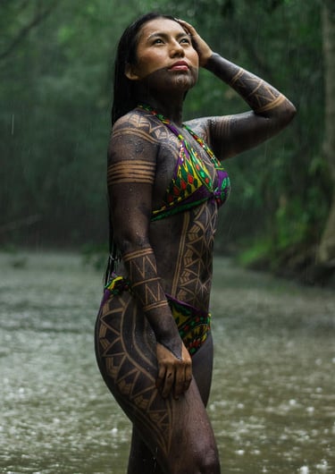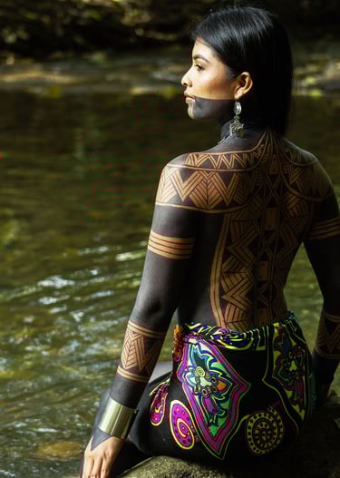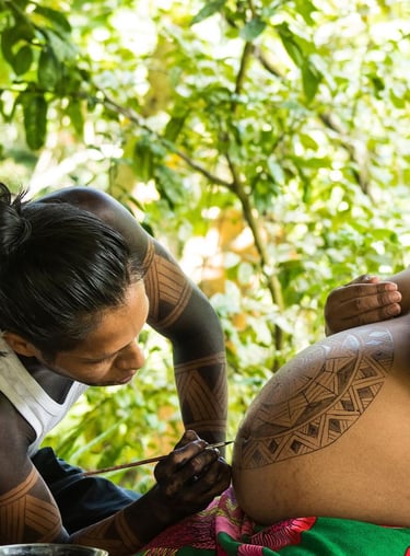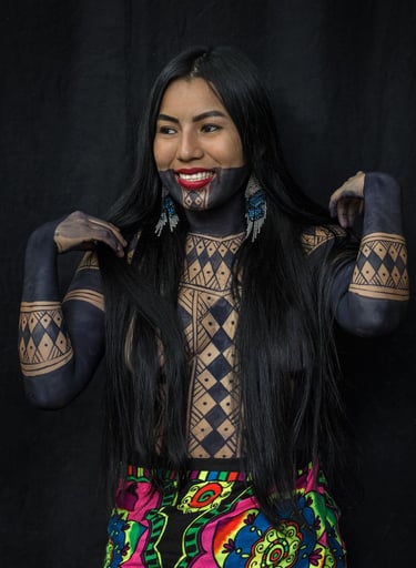 Alla, Elio Cunampio, miembro de este grupo etnico, con sus manos dibuja grafismos geometricos sobre los cuerpos de las bellas mujeres de la tribu Embera. Su pincel se desiza sobre la piel con el tinte natural de la jagua, una planta ancestral de las selvas sudamericanas,