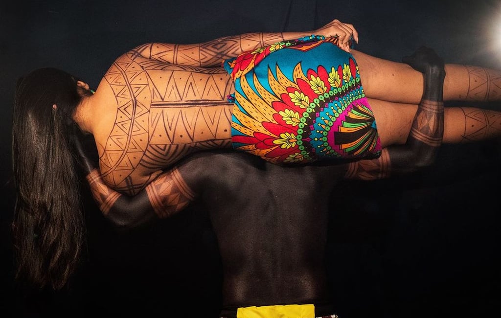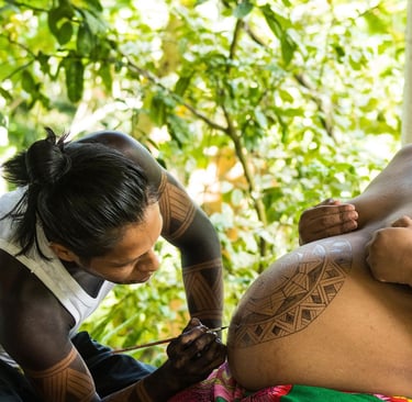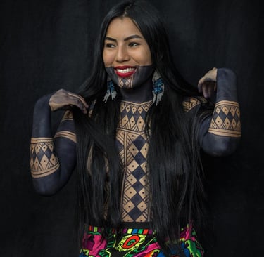 There, Elio Cunampio, a member of this ethnic group, draws with his hands geometrical graphics on the bodies of the beautiful women of the Embera tribe. His brush is drawn on the skin with the natural dye of the jagua, an ancestral plant of the South American jungles,