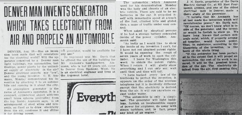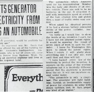 This is a newspaper story about C. Earl Ammann and his 'atmospheric generator' powered car: