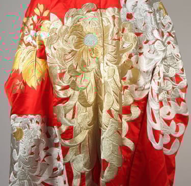 The shiromuku also features other traditional accessories, such as an “uchikake,” a long silk robe worn over the kimono and often decorated with detailed embroidery or gold leaf – which we’ll get into later. The kimono is worn with a special pair of sandals called “tatami,” made of woven straw and worn in traditional ceremonies.