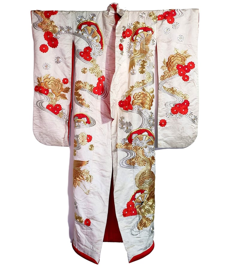 Bridal kimono typically feature the previously covered cranes and turtles, as well as traditional wedding motifs such as the “shinzen,” which symbolizes the gods and the couple’s wish for blessings in their marriage.