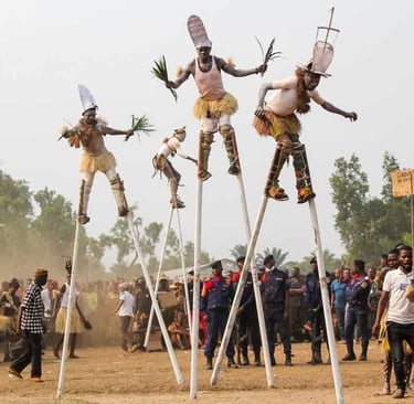 In this ceremony there are dances, songs and many different masks. There is even a dance performed by initiates in which they stand on very high stilts to dance.