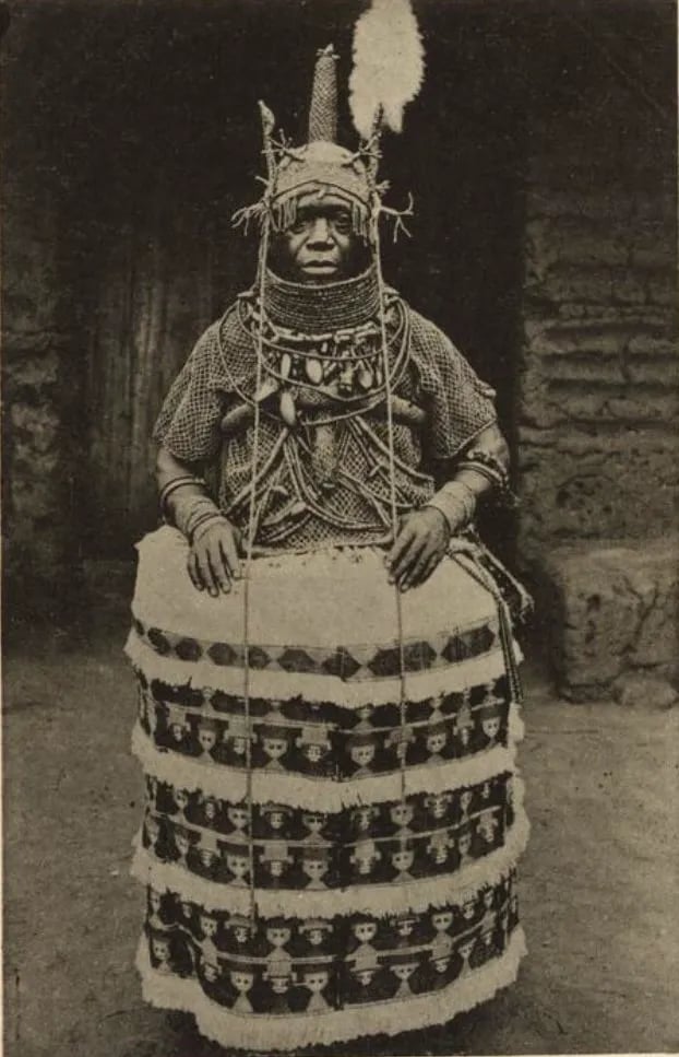 Oba of Benin in full ceremonial regalia. Nigeria, early 20th century. Postcard via Rand African Art (Public Domain).