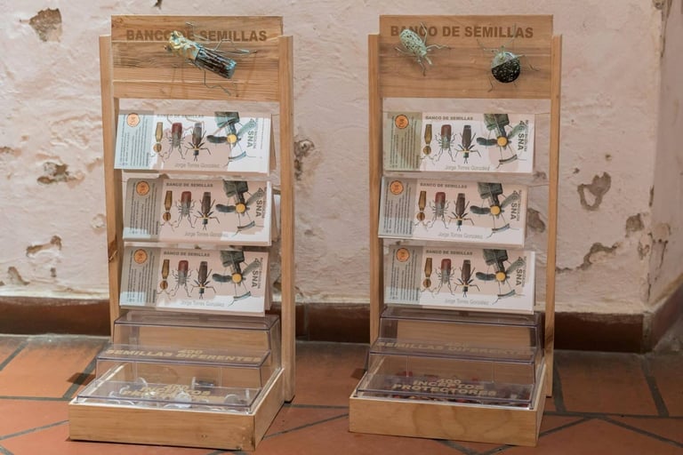 This installation carries underlying information of our heritage of flora, our agrarian reserve / endosperm, carpology and entomology, under these arguments we intend to generate multiple reflections to expand our perception of landscape, topsoil, our food security, protection of our resources, to ensure that Colombia begins to think about developing a large Seed Bank that fills us with pride.